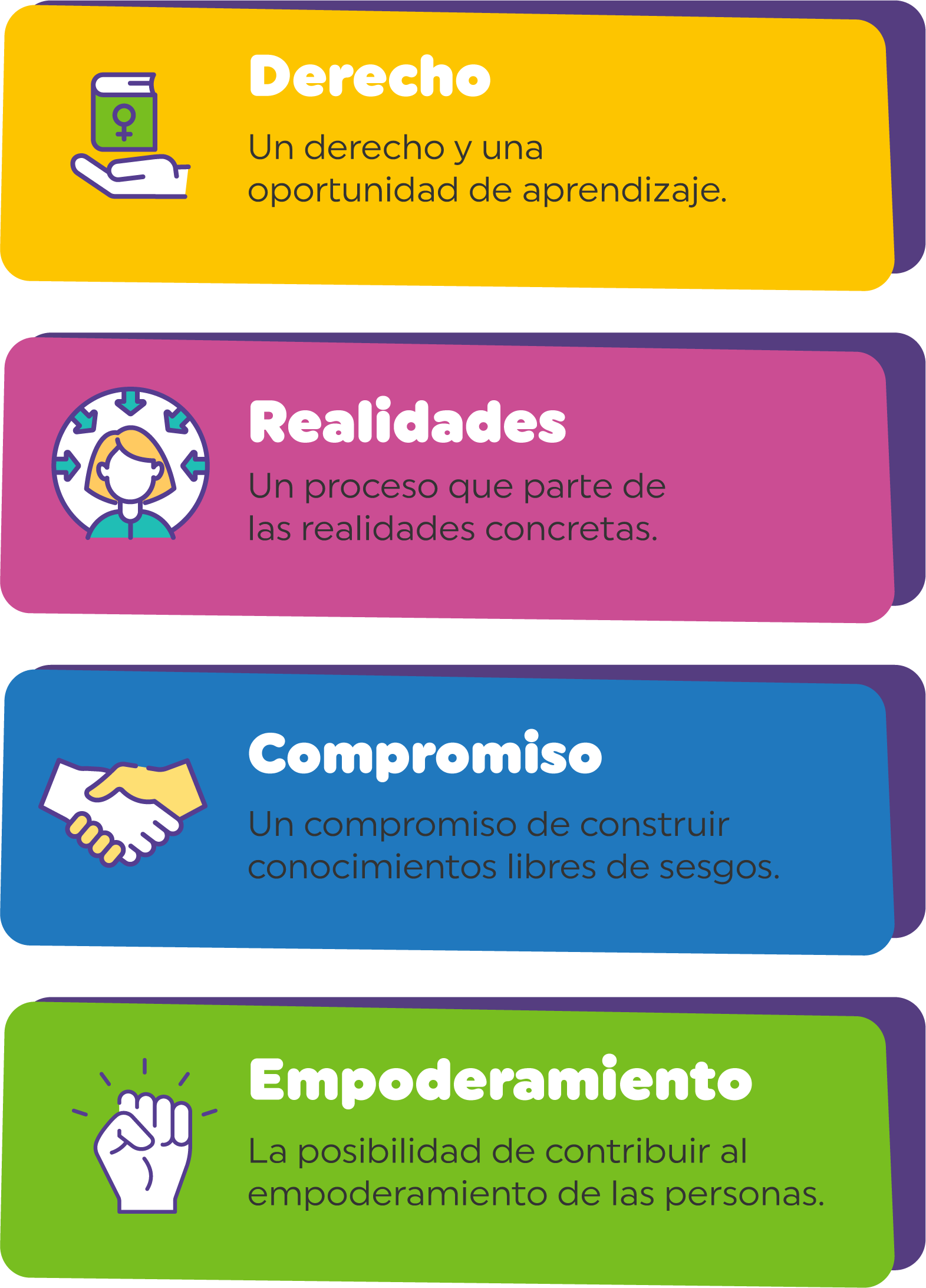Buscamos que todas las personas vivan de manera plena y placentera su sexualidad, a través del agenciamiento de sus derechos y al reconocerse como corresponsables del cuidado de la dignidad de las otras personas.
